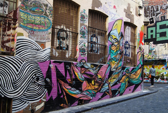 Art is often in the eye of the beholder. Someone who likes admiring the neat symmetry and wonderful workmanship of 19th century brickwork, mellowed by the elements and time would regard the graffiti in Hosier Lane as vandalism. Someone who is stimulated by the wild expanses of colour and form, quirky subject matter and loves the challenging "in-your-face" immediacy of the graffiti would quickly say this is truly art, as defined above.